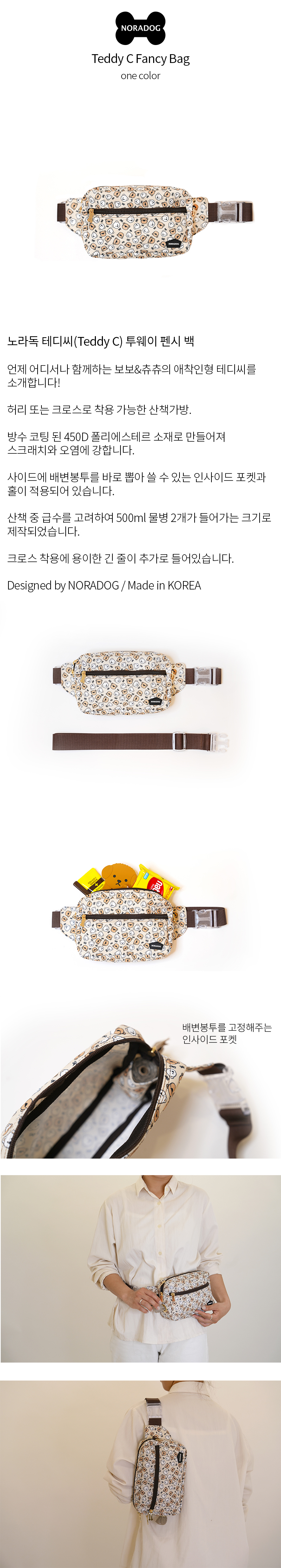 500ml 생수 2개가 들어가는 크기의 가방으로 허리 또는 어깨에 착용이 가능하며